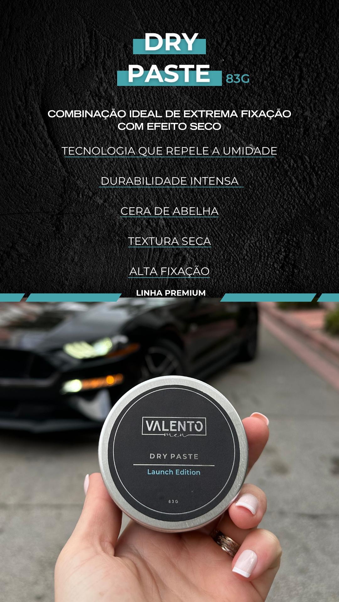 Transforme seu estilo com a Valento Dry Paste, a essência da maestria profissional para um visual impecável. Sua fórmula de extrema fixação e acabamento seco desafia a umidade, garantindo um penteado duradouro e sofisticado. Tenha o controle perfeito para definir seu legado, com um toque premium.